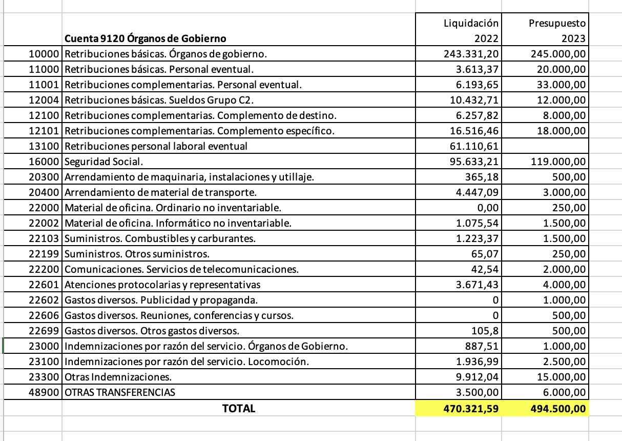 En el mismo sentido, la cuantía destinada a los órganos de gobierno superará en esta legislatura el medio millón de euros a pesar de haberlo negado el alcalde constantemente, practicando, por tanto, la mentira. El portavoz socialista mostró durante la sesión plenaria el capítulo presupuestario donde se recogen estos datos económicos que, antes de las subidas de sueldos, ascendía ya a 494.500,00 euros.  Pueden consultar en la tabla adjunta el detalle y cálculo de la partida correspondiente.